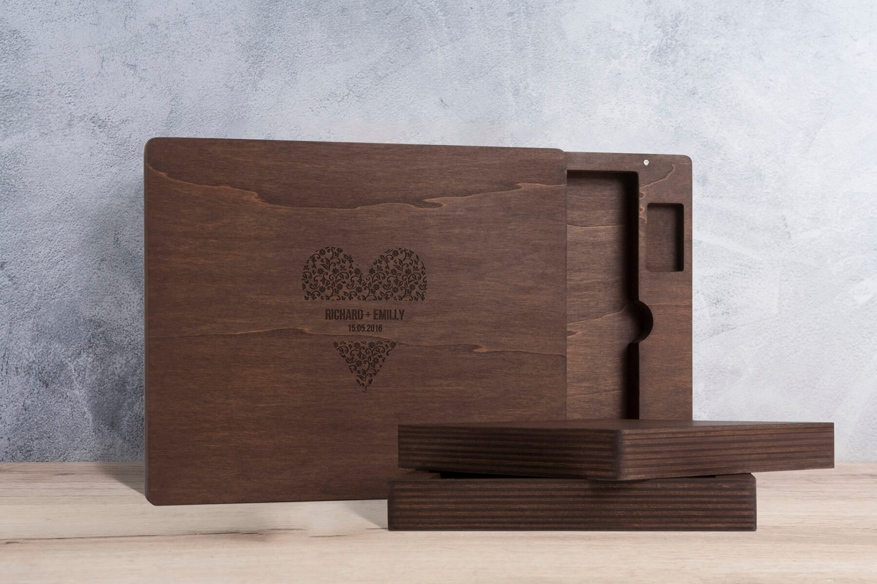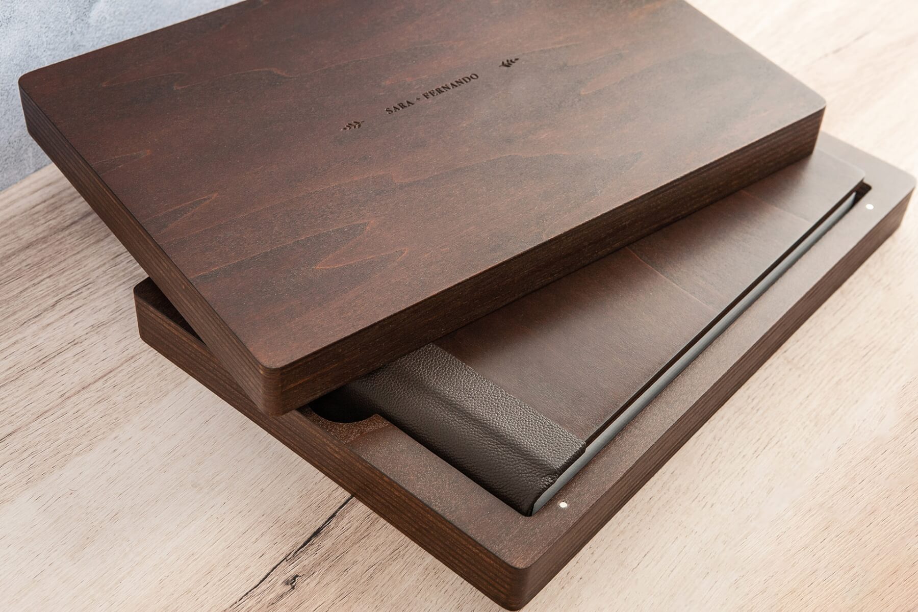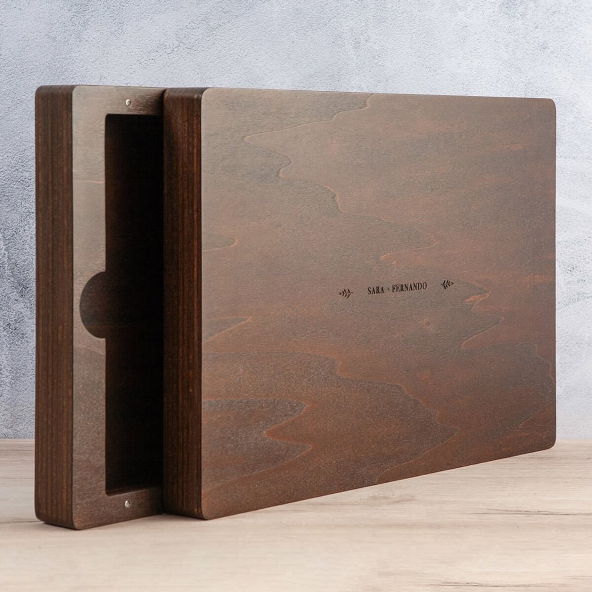 Berg nu jouw fotoalbum op in een bijpassende houten box. Kies voor de optimale bescherming van jouw fotoboek en bestel een opbergbox erbij. Deze krijgt dezelfde stijl als jouw fotoboek waardoor het een echte blikvanger in de kast of op de tafel is. En als extra kun je de foto’s op een unieke USB stick zetten en bewaren in de houten box.