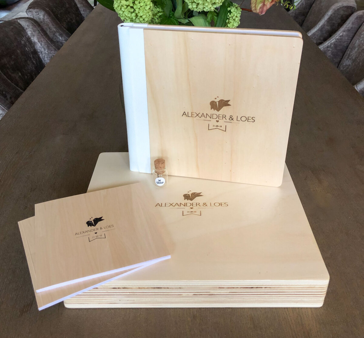 Een luxe album met box in een combinatie van hout met het mooiste leer – tot 80 pagina’s en vlakliggende fotobladen.