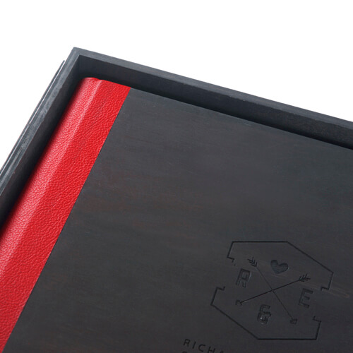 In 3 tinten hout met optie voor een vernislaag en dezelfde opdruk op boek en box