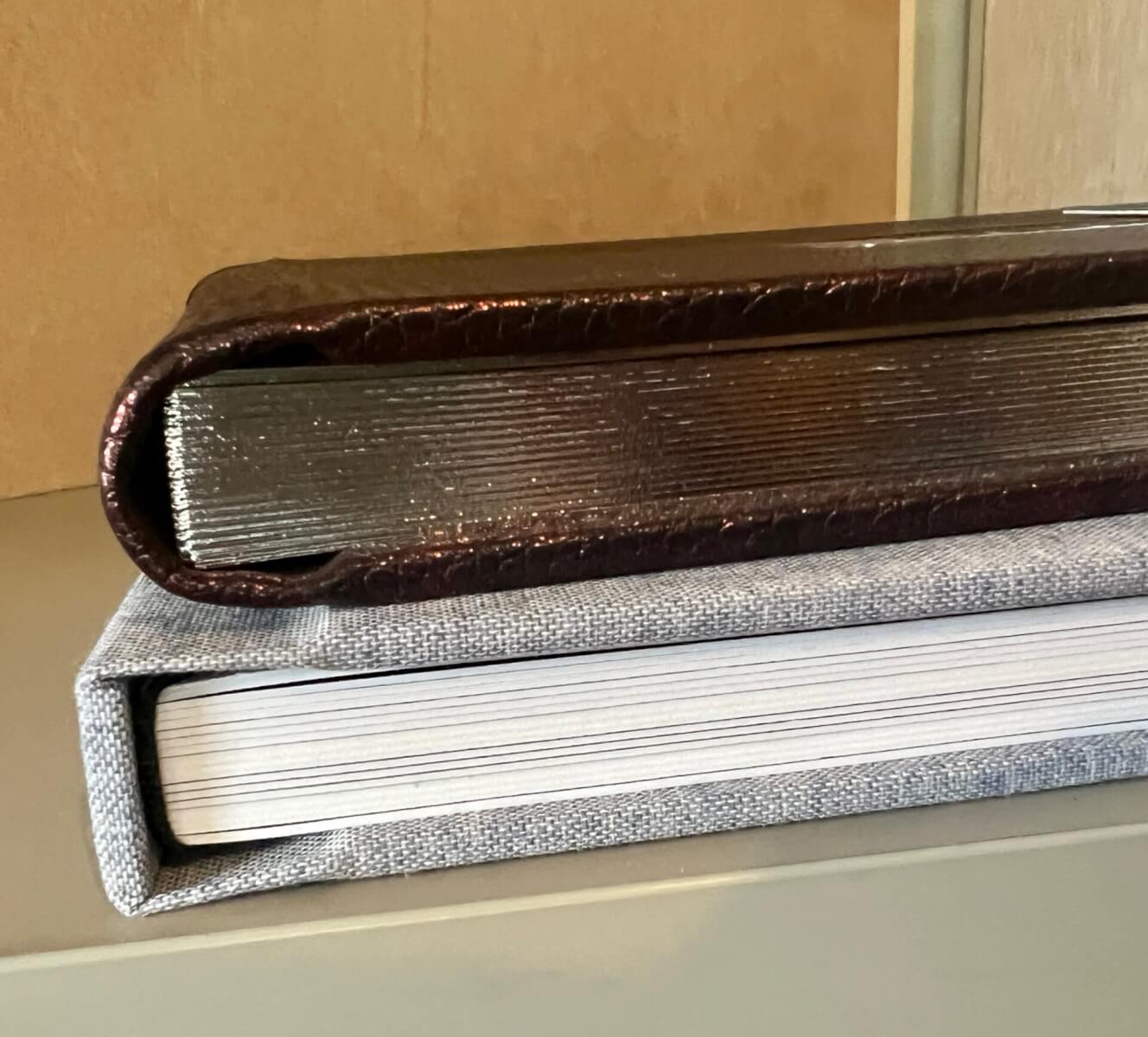 - Normale binding – de fotobladen zijn niet makkelijk buigbaar en verdikt met karton tussen de bladen. De fotobladen zijn ook hierbij vlakliggend.