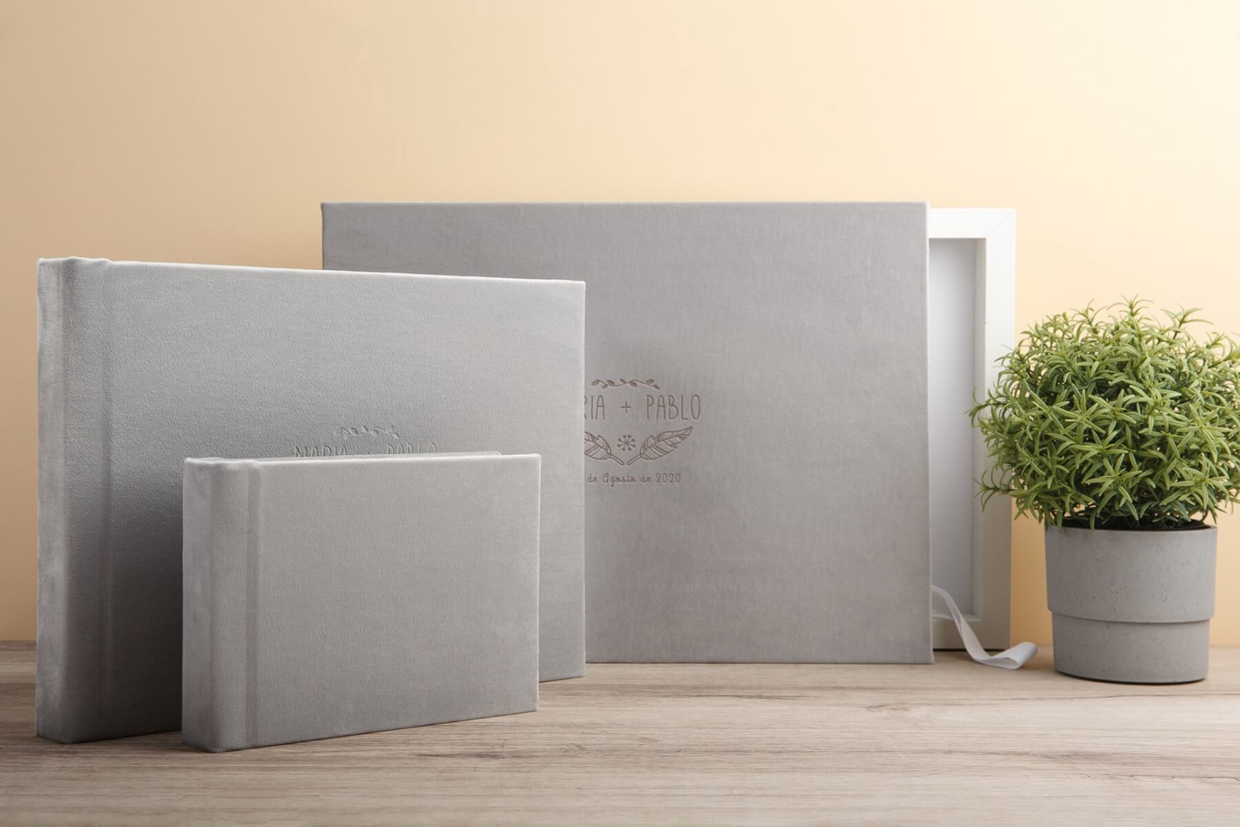 Dit pakket wordt gedrukt op milieuvriendelijk inkjetpapier en is beschikbaar in linnen, fluweel en suède (Lunak) stof. Leverbaar in 9 formaten – waarbij je keuze hebt tussen een vierkant, staand en liggende formaten.  Met dikke vlakliggende fotobladen en als extra optie een UV print of mooie strakke letters op meerdere regels met of zonder een kleurfolie. En wat dacht je van een foto achter acryl op een fluwelen kaft. Ook dat is een optie voor deze set.