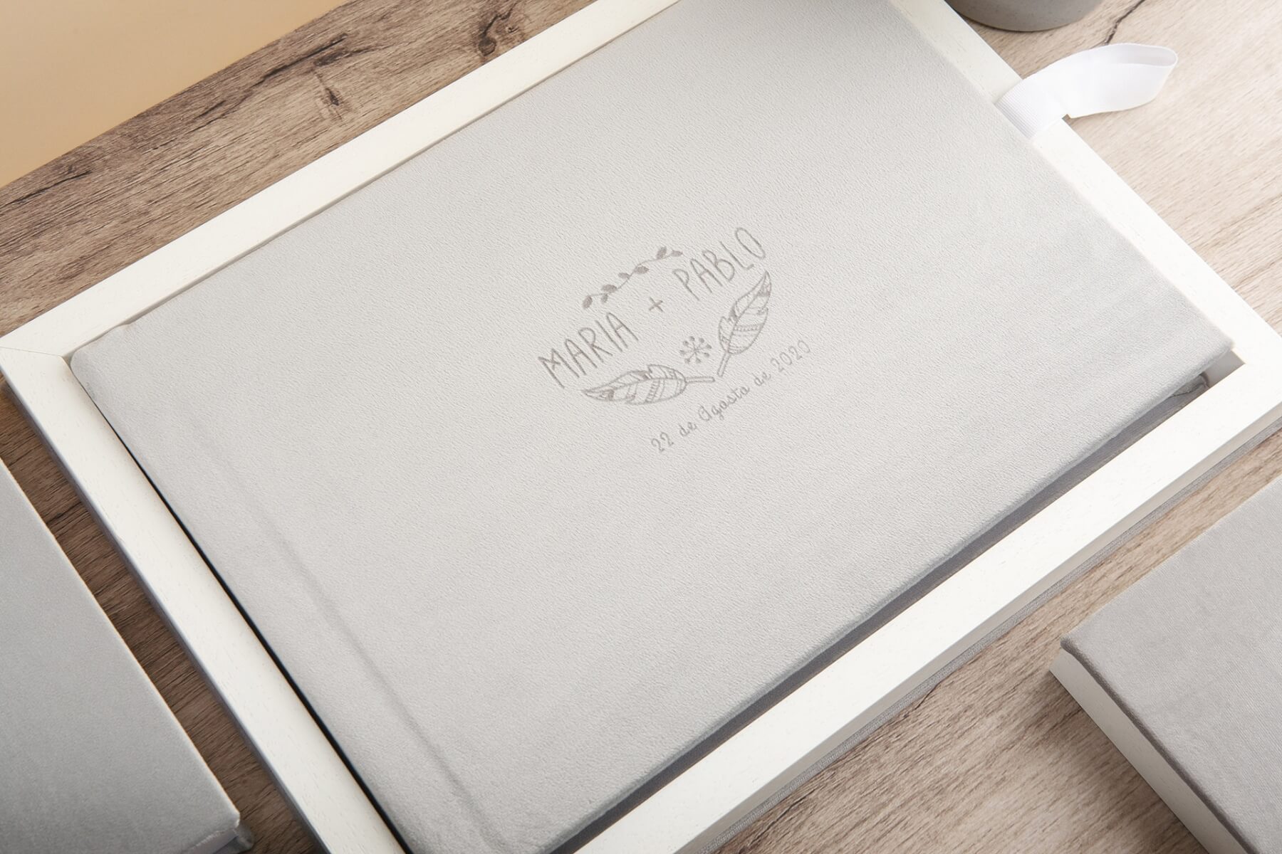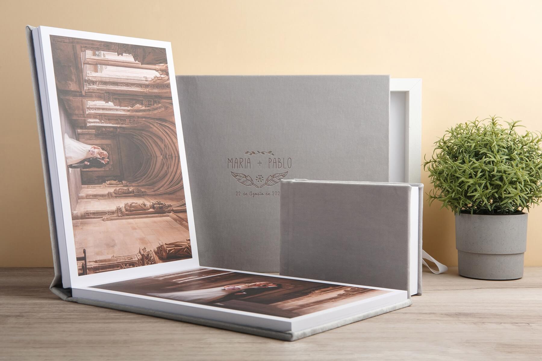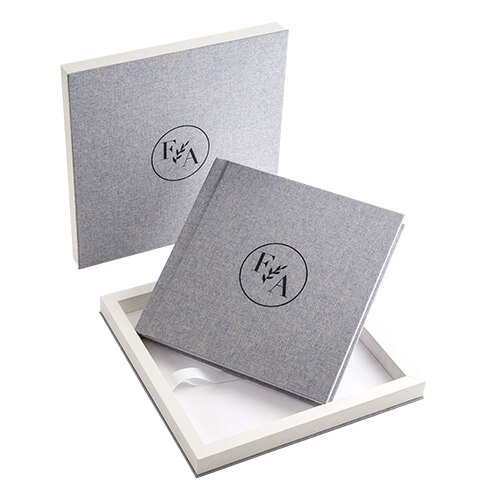 De mooiste foto’s van jullie huwelijk horen thuis in een groot formaat album, met een luxe linnen, fluwelen of suède kaft welke in een luxe opbergdoos in dezelfde stof en met dezelfde opdruk van jullie namen en datum kan worden opgeborgen.