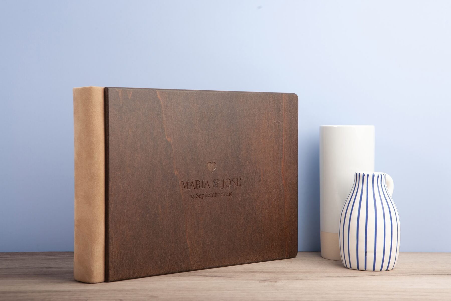 Een luxe en voordelige houten set album met box gecombineerd met het mooiste suède, fluweel, retro stof of leer – tot 100 pagina’s en vlakliggende fotobladen.